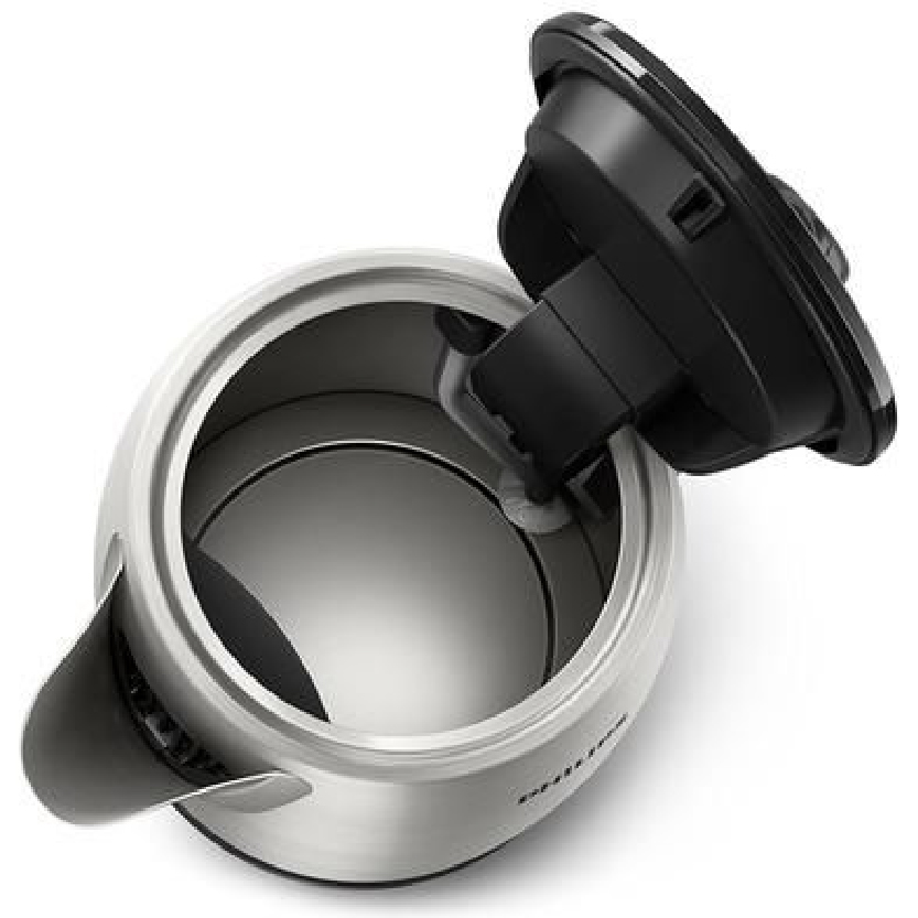 The kettle sits on a 360 degree cordless base, allowing effortless lifting and placement from any direction. An ergonomic grip provides comfortable handling, while non slip feet ensure stability during use. The flat concealed heating element supports efficient boiling and easy maintenance.