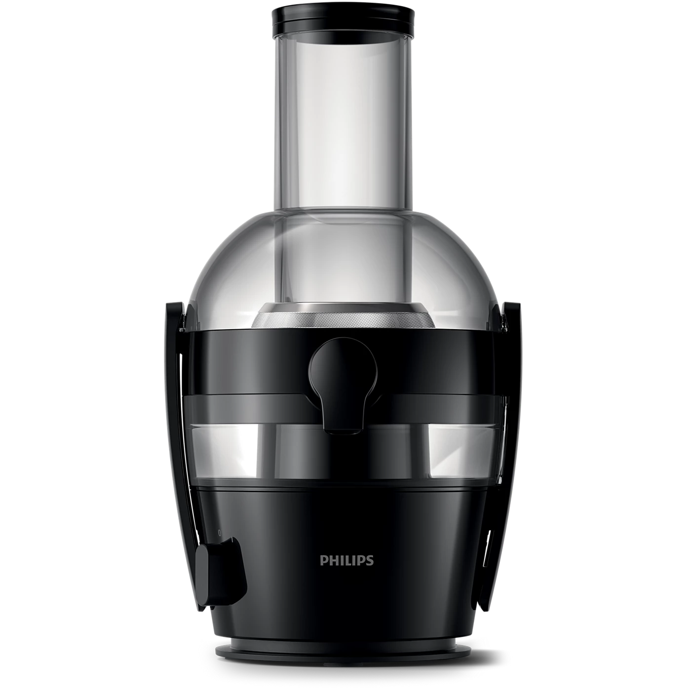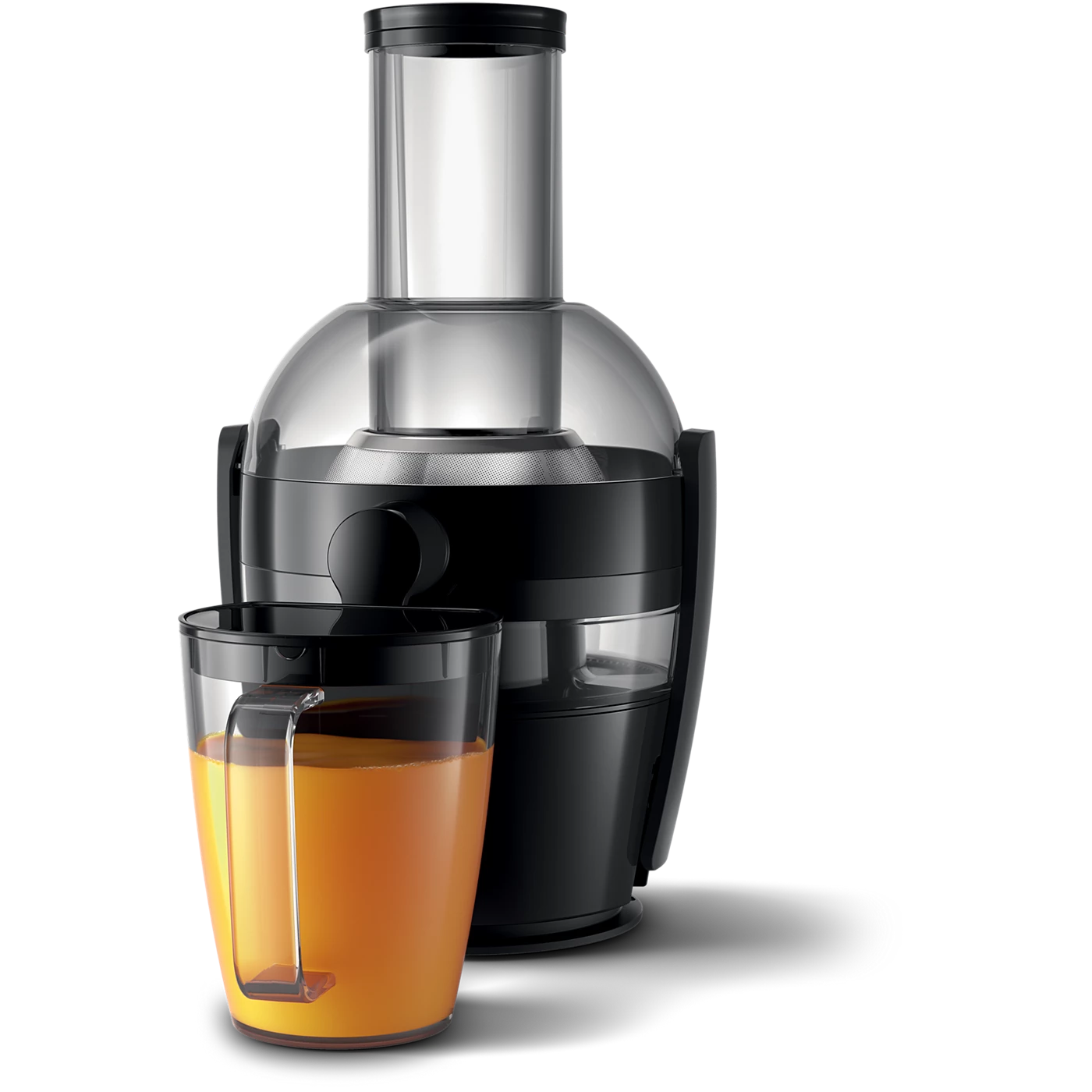 The juicer features quick and easy assembly of all parts, ensuring a hassle-free experience from start to finish. Its sleek black design complements modern kitchens while offering durable and reliable Philips performance.