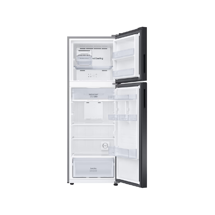 The Samsung Refrigerator RT35 22 is a top-mount freezer refrigerator with a total net capacity of 345 litres, designed for medium-sized households needing efficient and reliable cooling. It uses a Digital Inverter compressor that adjusts its speed automatically to provide energy-efficient, quiet performance and longer compressor life. The refrigerator features No-Frost technology, eliminating the need for manual defrosting, and an All-Around Cooling system that circulates cool air evenly throughout both the fridge and freezer compartments to help keep food fresh longer.