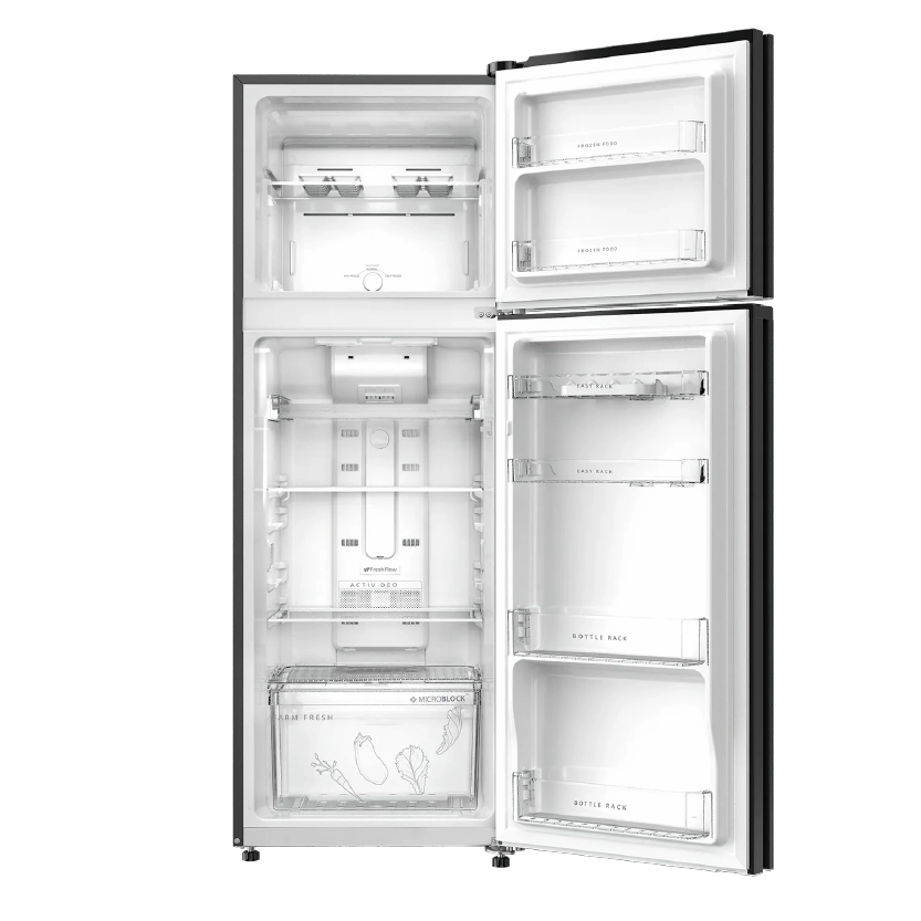 This refrigerator is built to preserve food for longer periods. Chicken, fish, and meat can be safely stored in the freezer for up to thirty days, while vegetables remain fresh for up to fourteen days. During electricity interruptions, essential items like milk stay preserved for up to fifteen hours, helping reduce food spoilage during load shedding. Advanced MicroBlock Technology helps limit bacterial growth, while Active Deo with Fruits Crisper works to control odor and maintain hygienic storage.