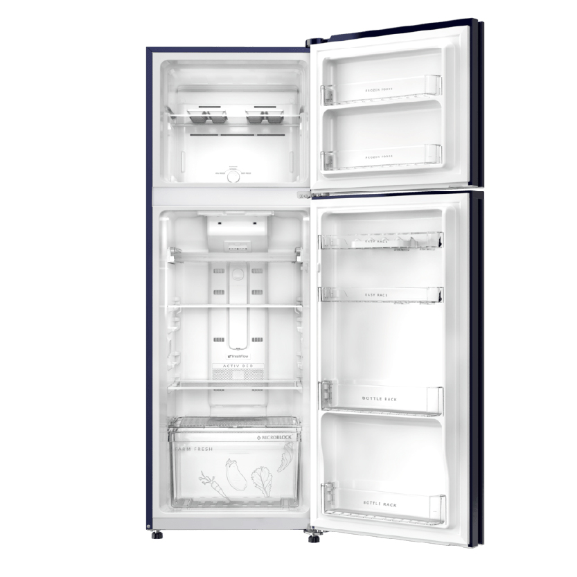 This refrigerator is specially designed to preserve food for extended periods. Fresh vegetables can stay crisp for up to fourteen days, while milk remains fresh for up to fifteen hours during power cuts, helping reduce spoilage during load shedding. The freezer section allows chicken, fish, and meat to be stored safely for up to thirty days, making it ideal for families who prefer bulk shopping. Advanced MicroBlock Technology helps inhibit bacterial growth, while Active Deo with Fruits Crisper maintains hygiene and controls odor inside the cabinet.